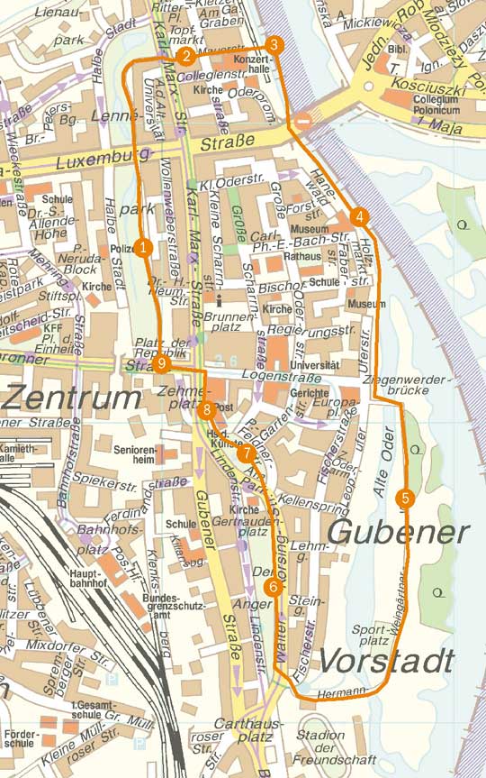 | ihres Musiklebens oder auch mit der neuen, alten Universität, der „Viadrina“, an der auch Thomas Müntzer, legendäre Gestalt des Bauernkrieges, vor fünfhundert Jahren studiert hatte. Doch ein Spaziergang entlang des innerstädtischen Grüngürtels erweist sich als ein touristischer Leckerbissen der besonderen Art. Es ist ein Rundgang von etwa 4 Kilometern Länge, der sich durch Abstecher in das historische und moderne Zentrum erweitern lässt und etwa zwei Stunden dauert. | ![]() |