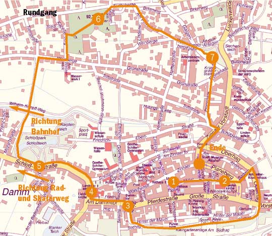 den Südweg und entlang der Stadtmauer zum Ausgangspunkt unserer Rundfahrt.
