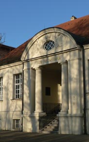 In die heutige Alte Forstakademie (1) zog 1830 die neu gegründete "Höhere Forstlehranstalt" ein. Der preußische Staat hatte zu diesem Zweck Gebäude und 20 EBERSWALDE Grundstück am Flüsschen Schwärze für 8.500 Taler gekauft. Es gehörte den Nachkommen des Berliner Fabrikanten und Bankiers David Schickler, der das Gebäude 1795 hatte errichten lassen. Um 1830 befanden sich in der unteren Etage ein Hörsaal, ein Sammlungsraum, zwei Büroräume und ein Aktenzimmer. Im Obergeschoss, das 1913 abgetragen wurde, wohnte der Leiter der "Höheren Forstlehranstalt" Pfeil. Hier hatte auch die Bibliothek ihr Zuhause. Auf dem Medaillon rechts unten ist Friedrich Wilhelm Leopold Pfeil zu sehen. Heute wird das Haus von der Fachhochschule noch immer als Vorlesungs- und Seminargebäude genutzt.