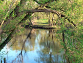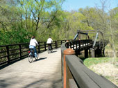 Links und rechts der Spree führen Radwege entlang des naturbelassenen Flusses in Richtung Cottbuser Innenstadt (Spreeradwanderweg). Wenn Sie den Radweg benutzen wollen, der sich östlich der Spree befindet, müssen Sie die Hermann-Löns-Brücke (2) überqueren. Seit ihrer Errichtung im Jahre 1995 verbindet sie die südwestlichen Cottbuser Wohngebiete mit der Branitzer Parklandschaft.